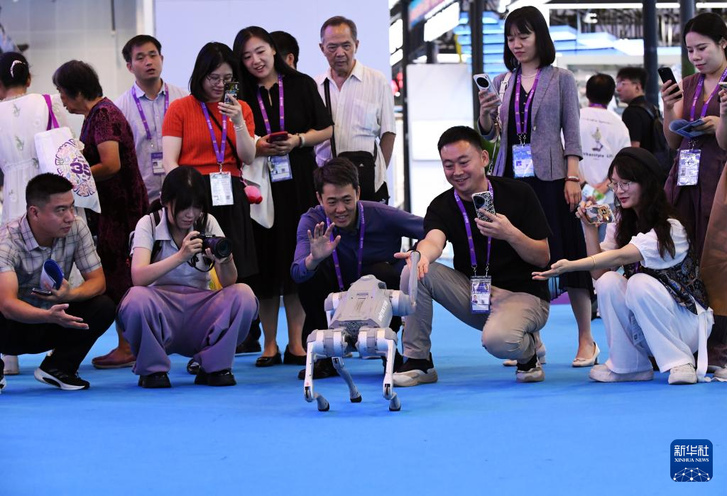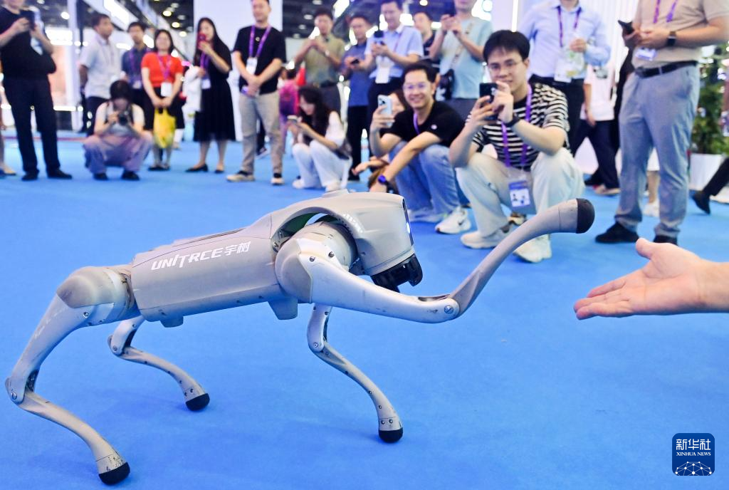 9月19日,在广西南宁国际会展中心,机器狗与参观者互动。