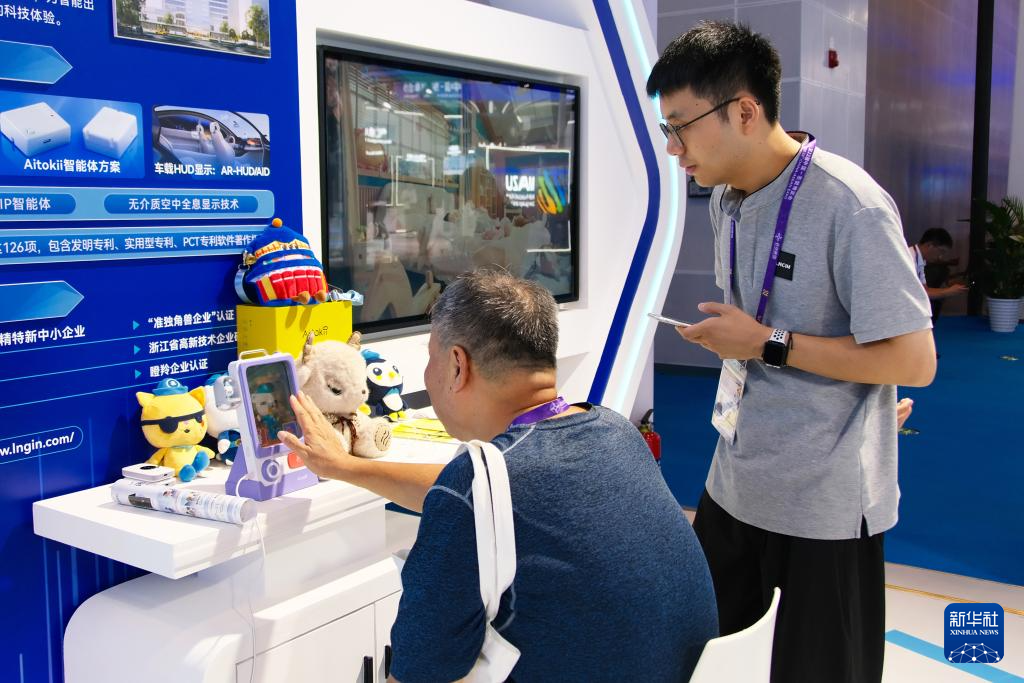 9月19日,在南宁国际会展中心,参观者体验一款裸眼3D的AI儿童陪伴机器人。