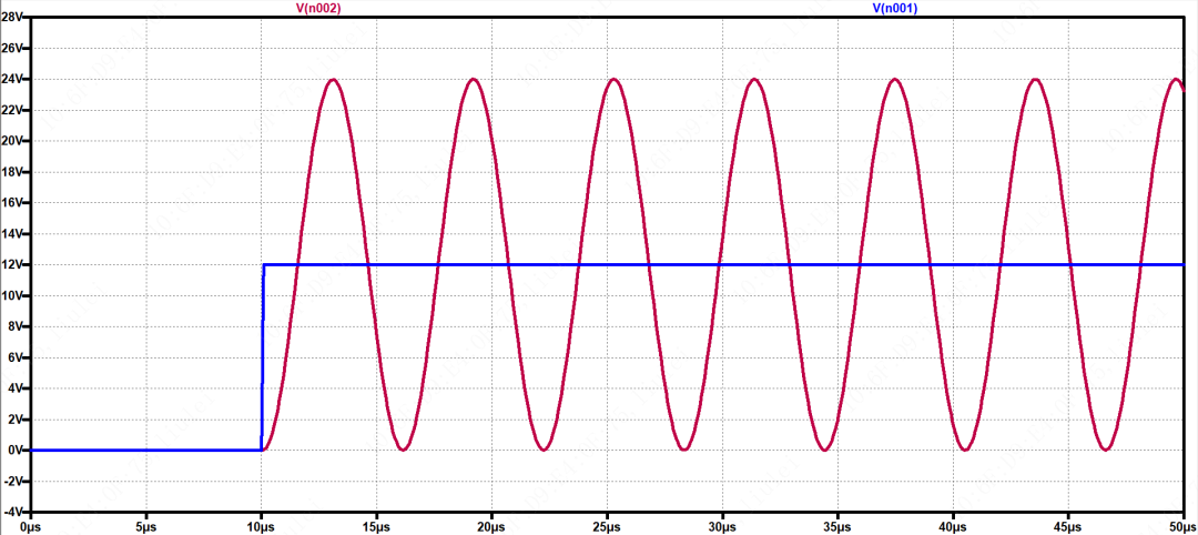 从图2的仿真结果来看,当蓝色的输入电压由0V升高到12V的时候,电容C1上的电压并不是升高到稳定的12V,而是变成了振荡的正弦波,而正弦波的峰值电压则达到了24V,是输入电压12V的2倍。如果这个电压超过了电路中的元件的最高耐压值,就会造成这些元件的损坏。