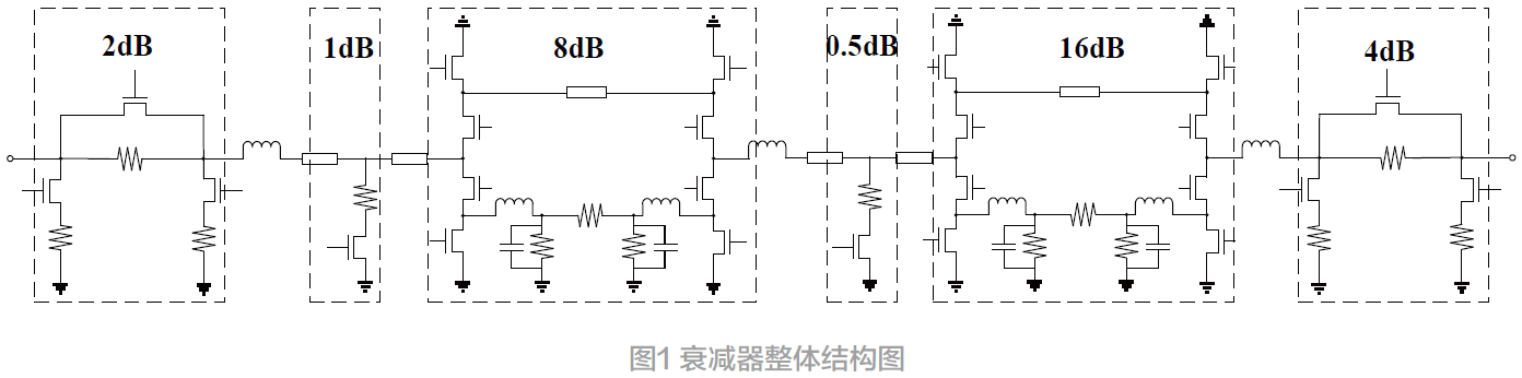 本文设计的衰减器的电路由6 位衰减量不同的基本衰减位级联而成,每个基本的衰减单位都由独立的互补数字电平控制,通过对串联开关管和并联开关管的控制实现参考态和衰减态之间的切换。根据每一个基本衰减态的端口特性,电路按照2、1、8、0.5、16、4 dB 的排列方式实现,在一些基本衰减单元之间,加入电感与电路的寄生电容谐振来实现更好的级间匹配,以便可以实现更好的幅度、相位特性[3]。整体结构如图1 所示。