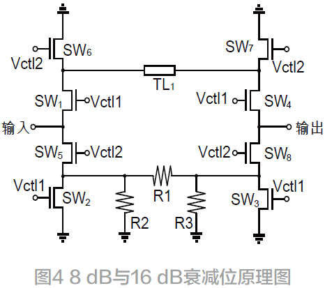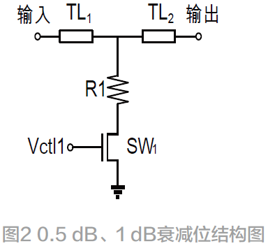 当控制电压Vctl1 为高电平Vctl2 为低电平时,SW1导通SW2 截止,衰减位工作在导通状态;当控制电压Vctl2 为低电平、Vctl1 为高电平时,SW1 截止SW2 导通,衰减位工作在衰减状态。