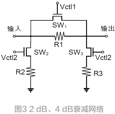 2 db 与4 db 衰减位采用的是如图3 所示的Pi 型衰减网络结构。该结构采用在Pi 型电阻网络中加入开关管控制通断实现,具有两条到地的信号通路,可以在衰减状态下更大的衰减状态,适合于中等及大衰减位的设计[4]。