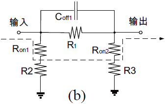 图5(a)中给出了Pi 型衰减在参考态的等效电路图。在参考状态下SW1 表现为导通电阻Ron1,SW2 与SW3表现为关断电容COff2与COff3[6]。因为R1 电阻远大于开关管的导通电阻,所以信号基本从传输阻抗低的开关管等效导通电阻传输,此时消耗在等效电阻上的信号损耗表现为衰减位的插入损耗。而两条由关断电容与衰减电阻串联到地的通路可以等效看成一个低通通路,会造成输出信号相位相比与输入信号相位滞后。