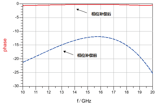 如图6 所示为16 dB 衰减位相位补偿前后的相位特性图。图中红色实线为相位补偿后附加相移特性曲线,蓝色虚线为相位补偿前的附加相移特性曲线。可以看出经过相位补偿后,16 dB 衰减位的附加相移有显著的降低。