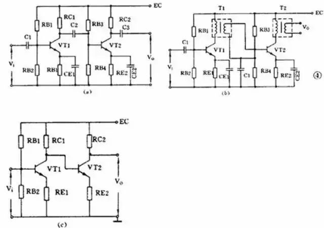 ③ 直接耦合(见图c): 优点是频带宽,可作直流放大器使用,但前后级工作有牵制,稳定性差,设计制作较麻烦。