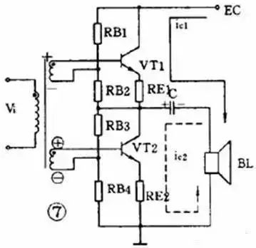 这个电路不管有没有输入信号,晶体管始终处于导通状态,静态电流比较大,困此集电极损耗较大,效率不高,大约只有 35 %。这种工作状态被称为甲类工作状态。这种电路一般用在功率不太大的场合,它的输入方式可以是变压器耦合也可以是 RC 耦合。