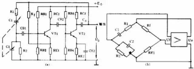 一个振荡器必须包括三部分:放大器、正反馈电路和选频网络。放大器能对振荡器输入端所加的输入信号予以放大使输出信号保持恒定的数值。正反馈电路保证向振荡器输入端提供的反馈信号是相位相同的,只有这样才能使振荡维持下去。选频网络则只允许某个特定频率f0能通过,使振荡器产生单一频率的输出。