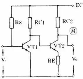 直流放大器不能用 RC 耦合或变压器耦合,只能用直接耦合方式。下图是一个两级直耦放大器。直耦方式会带来前后级工作点的相互牵制,电路中在 VT2 的发射极加电阻 R E 以提高后级发射极电位来解决前后级的牵制。