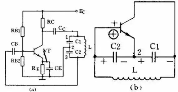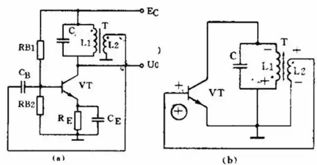 图(a)是变压器反馈 LC 振荡电路。晶体管 VT 是共发射极放大器。变压器 T 的初级是起选频作用的 LC 谐振电路,变压器 T