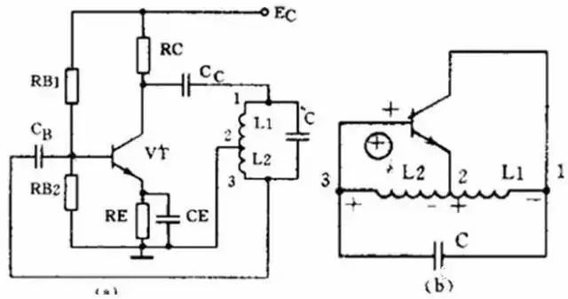 图(a)是另一种常用的电感三点式振荡电路。图中电感 L1 、 L2 和电容 C 组成起选频作用的谐振电路。从 L2 上取出反馈电压加到晶体管VT 的基极。从图(b)看到,晶体管的输入电压和反馈电压是同相的,满足相位平衡条件的,因此电路能起振。由于晶体管的 3 个极是分别接在电感的 3个点上的,因此被称为电感三点式振荡电路。